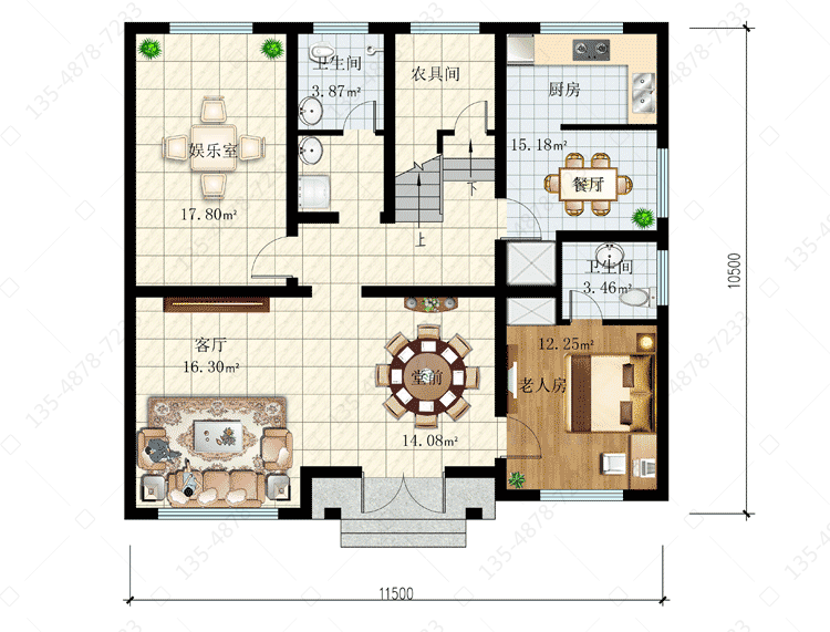 一 层:堂屋、客厅、老人房(附卫生间)、娱乐室、厨房、餐厅、农具间、卫生间