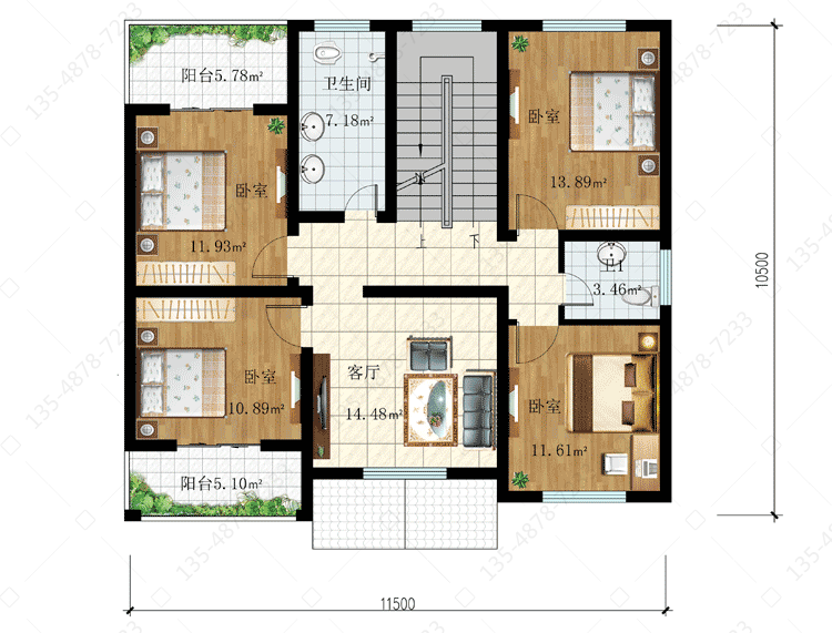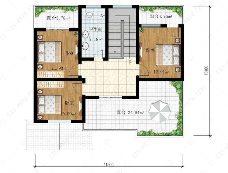 三 层:2卧室(附阳台)、卧室、卫生间、露台