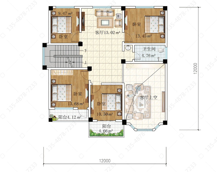 二 层:客厅、2卧室(附阳台)、2卧室、卫生间