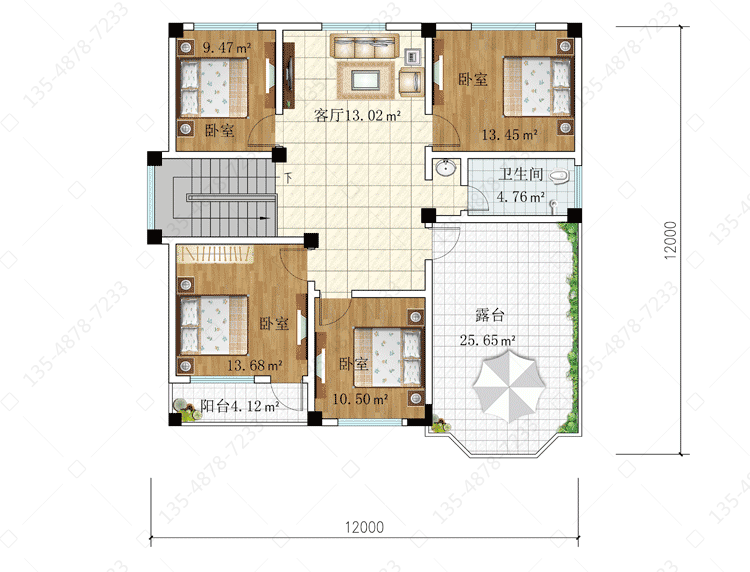 三 层:客厅、卧室(附阳台)、3卧室、卫生间、露台