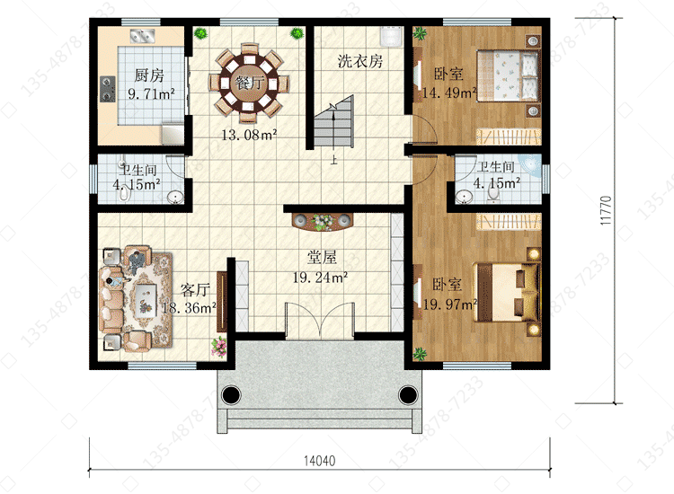 一 层:堂屋、客厅、卧室(附卫生间)、卧室、厨房、餐厅、卫生间