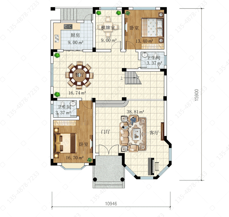 一 层:门厅、客厅(中空)、卧室(附卫生间)、卧室、棋牌室、厨房、餐厅、卫生间