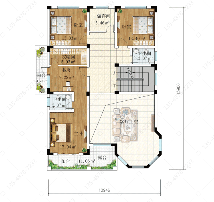 二 层:主卧(附书房,衣帽间,卫生间,2阳台,露台)、2卧室、储存间、卫生间