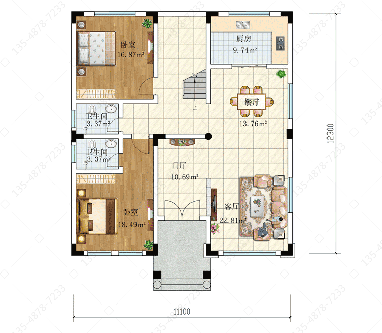 一 层:门厅、客厅(中空)、卧室(附卫生间)、卧室、厨房、餐厅、卫生间