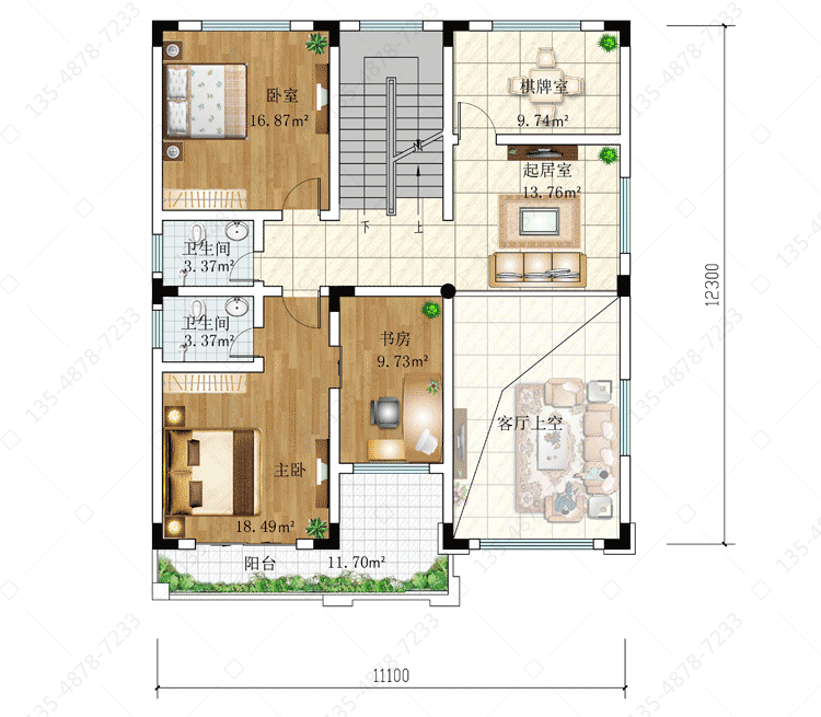 二 层:起居室、卧室(附书房,卫生间,阳台)、卧室、棋牌室、卫生间