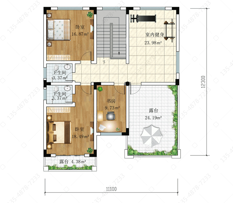 三 层:健身厅、卧室(附卫生间,露台)、卧室、书房、卫生间、露台