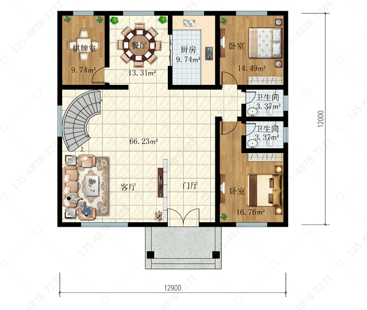 一 层:门厅、客厅(中空)、卧室(附卫生间)、卧室、棋牌室、厨房、餐厅、卫生间