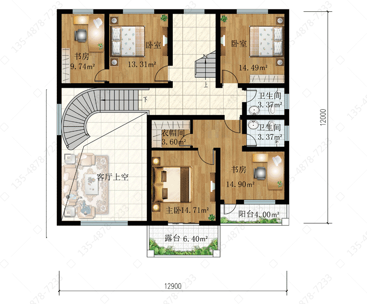 二 层:主卧(附书房,衣帽间,卫生间,阳台,露台)、卧室(附书房)、卧室、卫生间