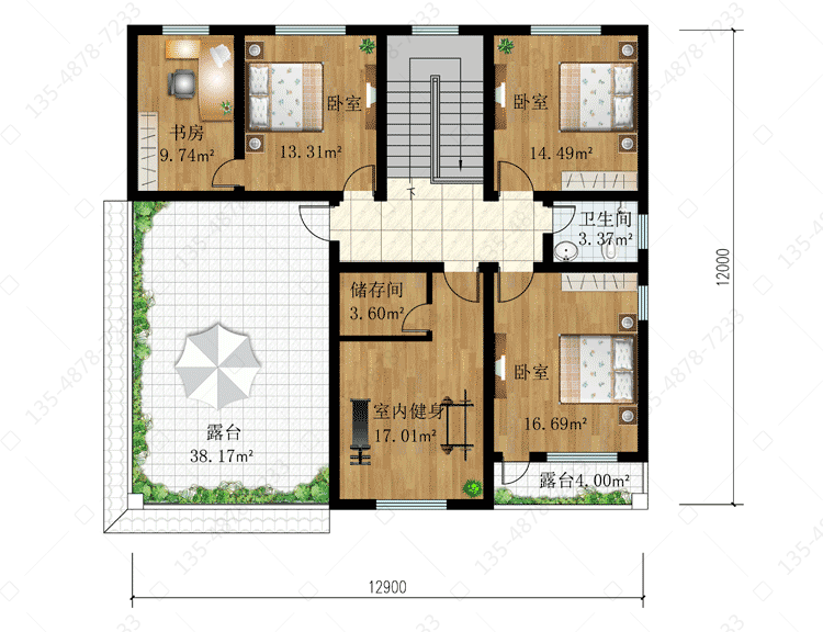 三 层: 健身房(附储藏间)、卧室(附露台)、卧室(附书房)、卧室、卫生间、露台