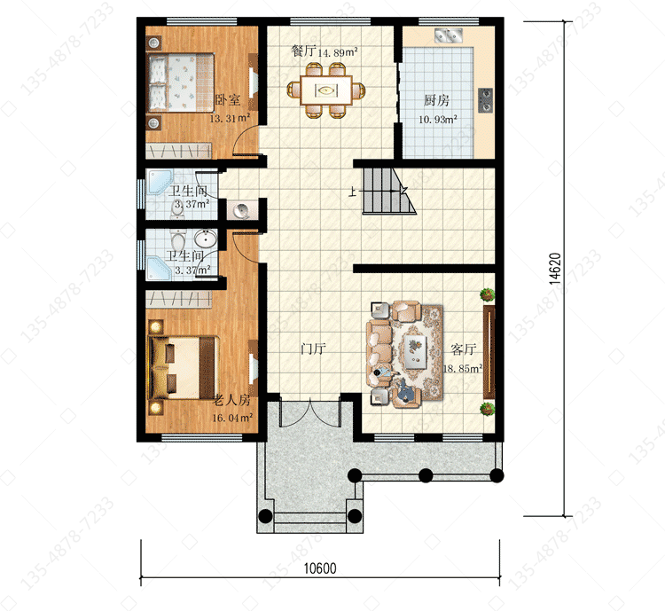 一 层:门厅、客厅、卧室(附卫生间)、卧室、厨房、餐厅、卫生间