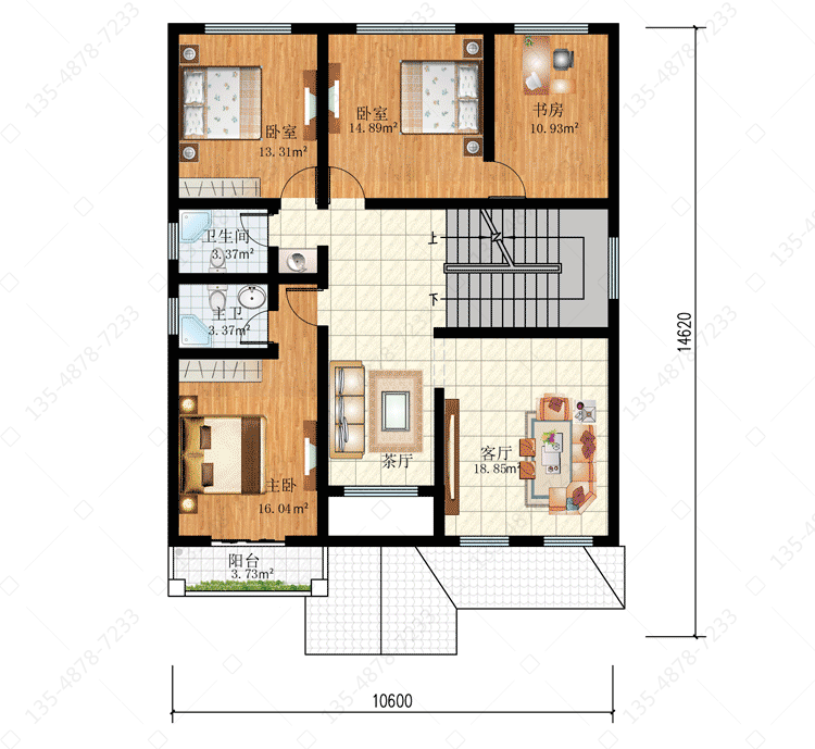 二 层:客厅、茶厅、卧室(附卫生间,阳台)、卧室(附书房)、卧室、卫生间