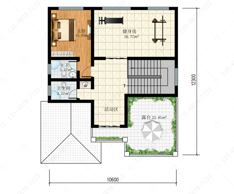 三 层:卧室(附卫生间)、健身房、卫生间、露台