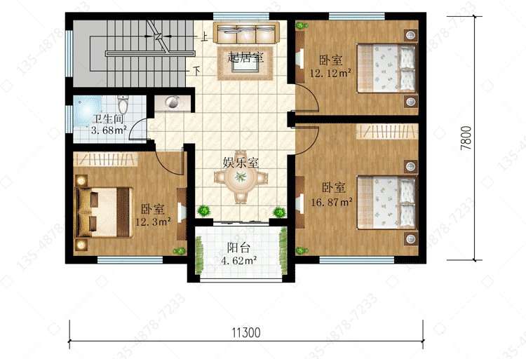 二 层:起居室、娱乐室(附阳台)、3卧室、卫生间
