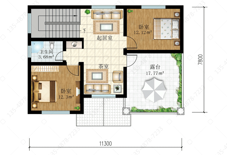 三 层:起居室、茶室、2卧室、卫生间、露台