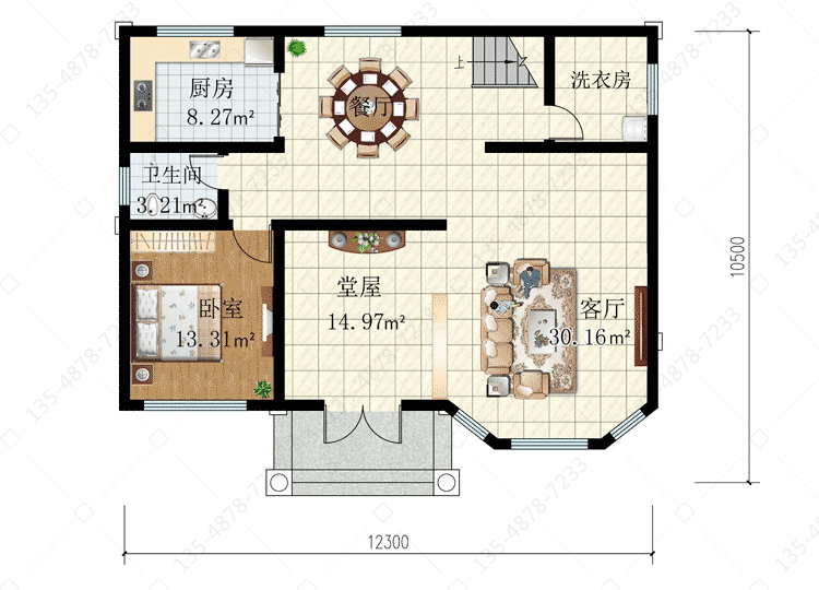 一 层:堂屋、客厅、卧室、厨房、餐厅、洗衣房、卫生间