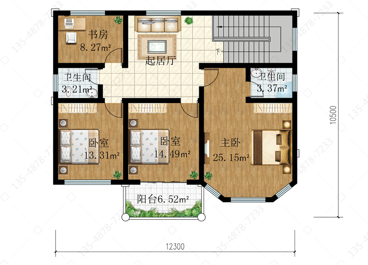 二 层:起居厅、卧室(附卫生间)、卧室(附阳台)、卧室、书房、卫生间