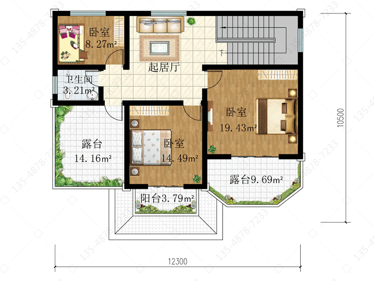 三 层:起居厅、卧室(附露台)、卧室(附阳台)、卧室、卫生间、露台
