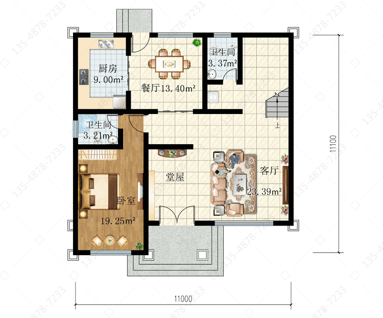 一 层:堂屋、客厅、卧室(附卫生间)、厨房、餐厅、卫生间