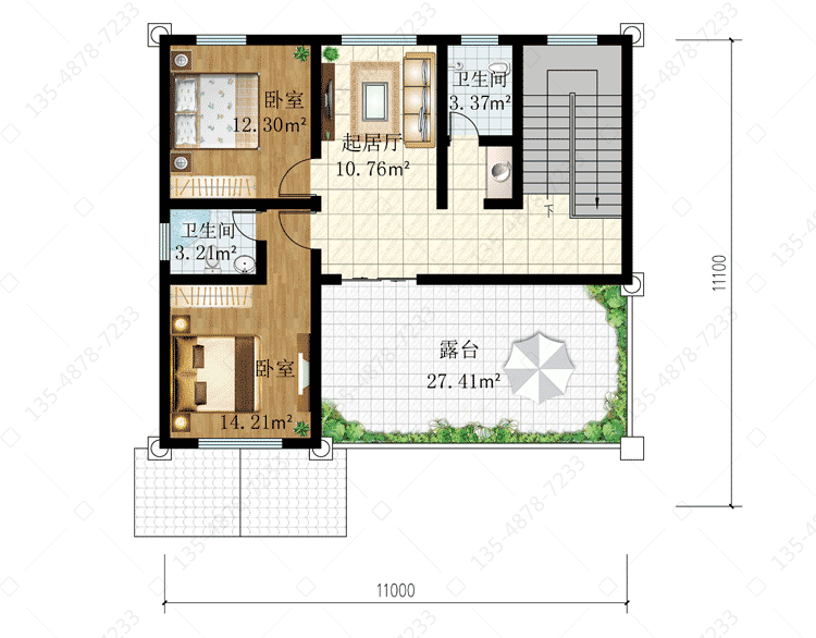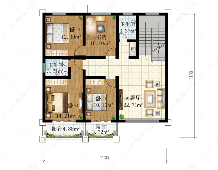 二 层:起居厅、卧室(附卫生间,阳台)、卧室(附露台)、卧室(附书房)、卫生间