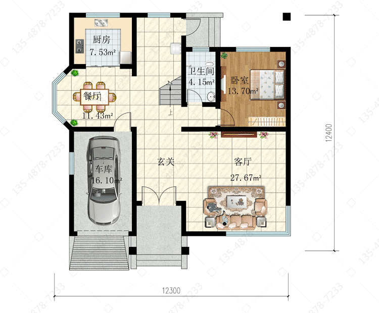 一 层:玄关、客厅、卧室、厨房、餐厅、卫生间、车库