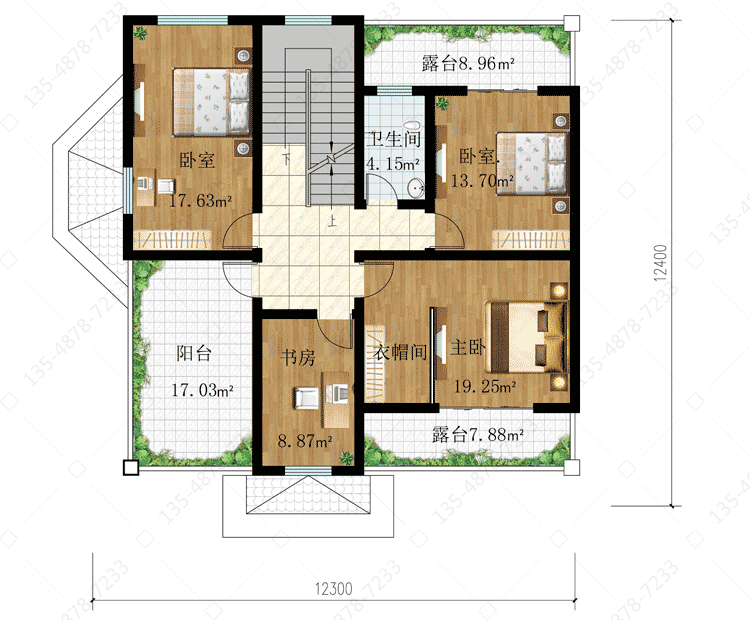 二 层:主卧(附衣帽间,露台)、卧室(附露台)、卧室、书房、卫生间、阳台