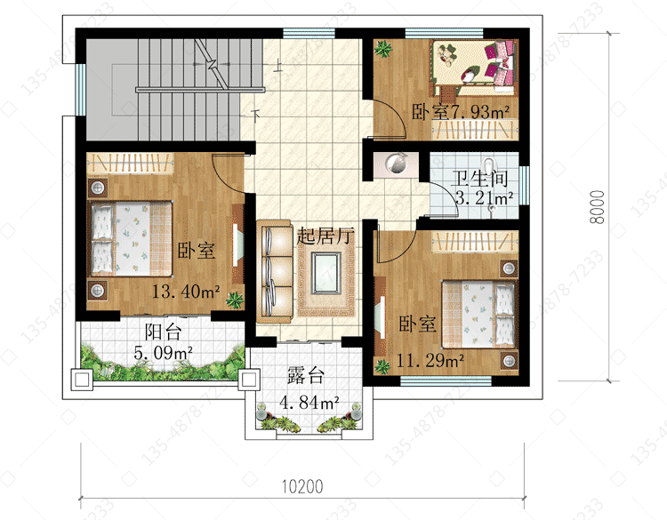 二 层:起居厅、卧室(附阳台)、2卧室、卫生间、露台