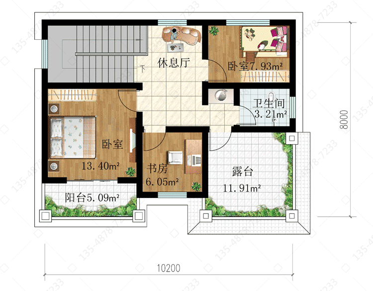 三 层:休息厅、卧室(附阳台)、卧室、书房、卫生间、露台