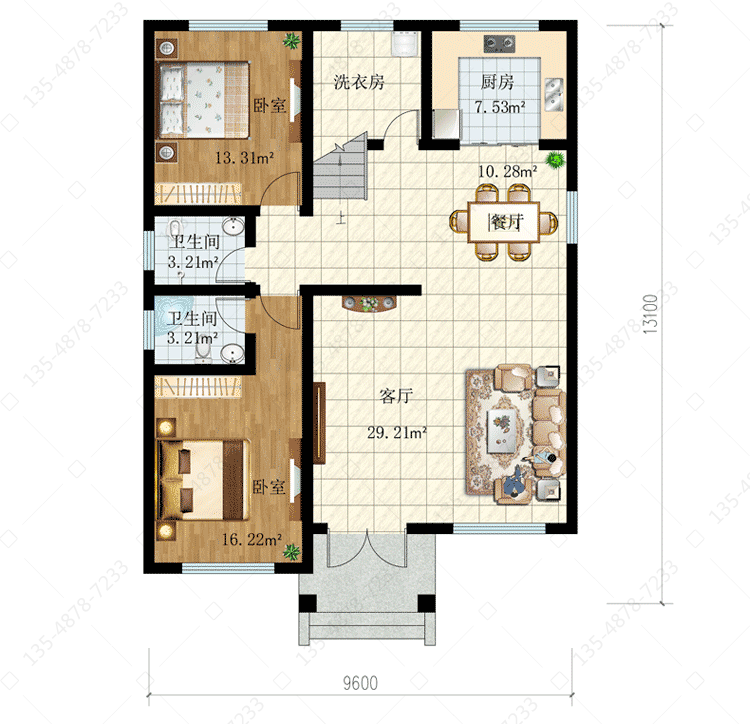 一 层:客厅、卧室(附卫生间)、卧室、厨房、餐厅、洗衣房、卫生间