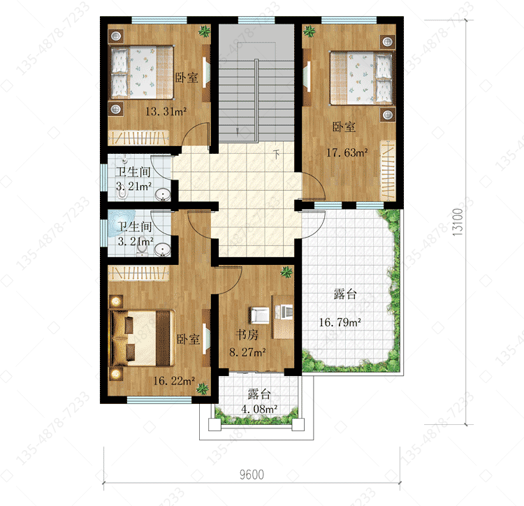 二 层:卧室(附书房、卫生间、露台)、2卧室、卫生间、露台