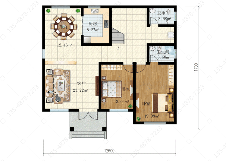 一 层:客厅、卧室(附卫生间)、卧室、厨房、餐厅、卫生间