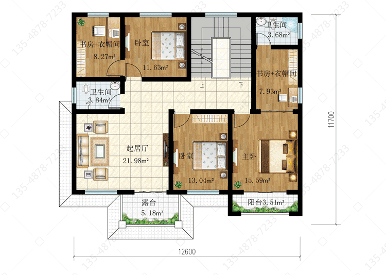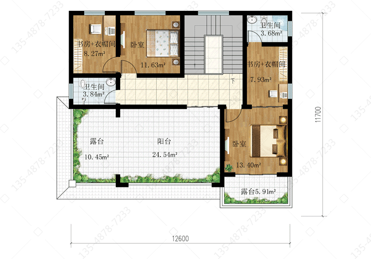 二 层:起居厅、主卧(附书房+衣帽间、卫生间、阳台)、卧室(附书房+衣帽间)、卧室、卫生间、露台