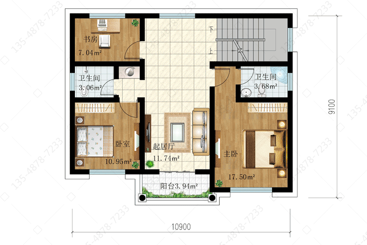 二 层:起居厅、主卧(附卫生间)、卧室、书房、卫生间、阳台