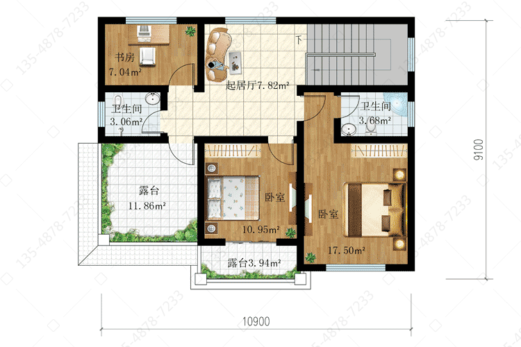 三 层:起居厅、卧室(附卫生间)、卧室(附露台)、书房、卫生间、露台