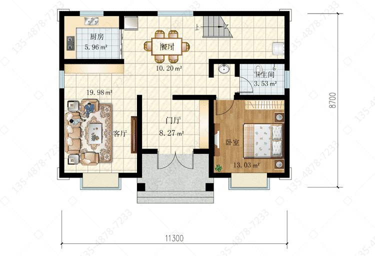 一 层:门厅、客厅、卧室、厨房、餐厅、卫生间