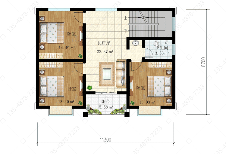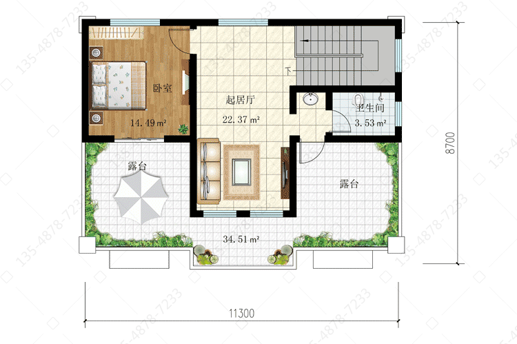 三 层:起居厅、卧室(附露台)、卫生间、露台