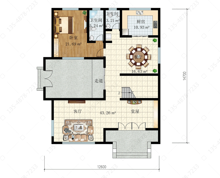 一 层:堂屋、客厅、卧室(附卫生间)、厨房、餐厅、卫生间