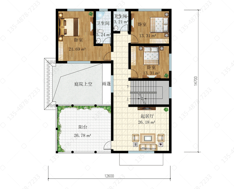 三 层: 卧室(附卫生间)、2卧室、卫生间、露台