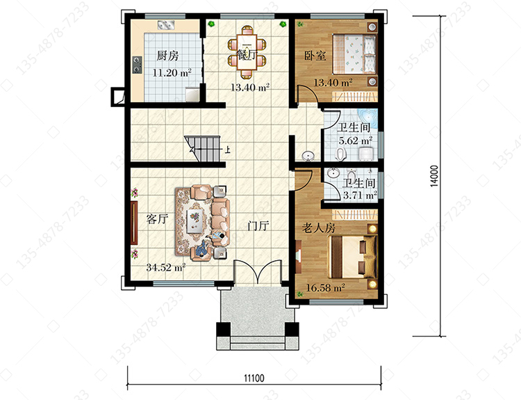 一 层:门厅、客厅(中空)、老人房(附卫生间)、卧室、厨房、餐厅、卫生间
