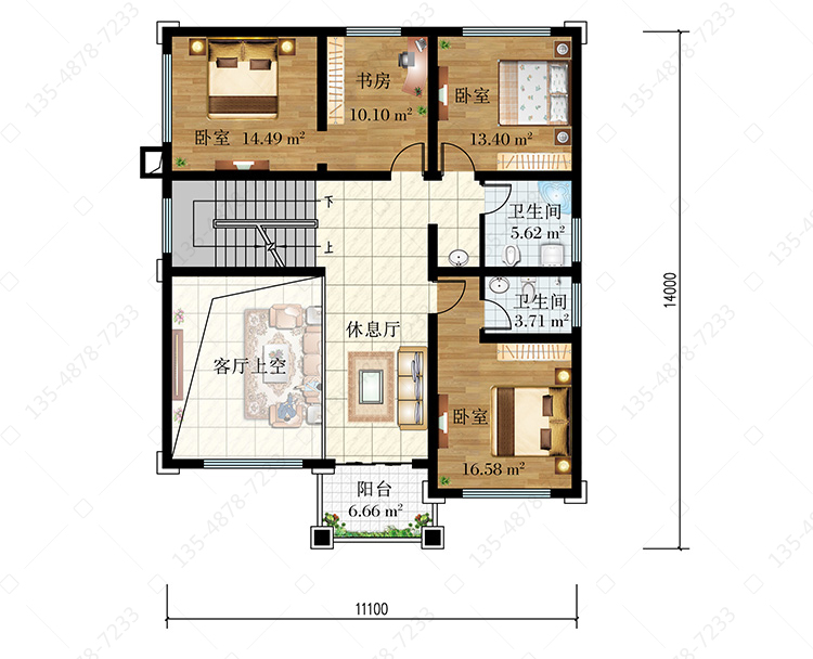 二 层:休息厅、卧室(附卫生间)、卧室(附书房)、卧室、卫生间、阳台