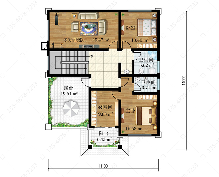 三 层:主卧(附卫生间、衣帽间、阳台)、多功能影厅、卧室、卫生间、露台