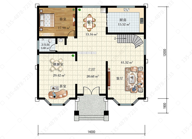 一 层:门厅、客厅(中空)、棋牌室、茶室、厨房、餐厅、卧室、卫生间