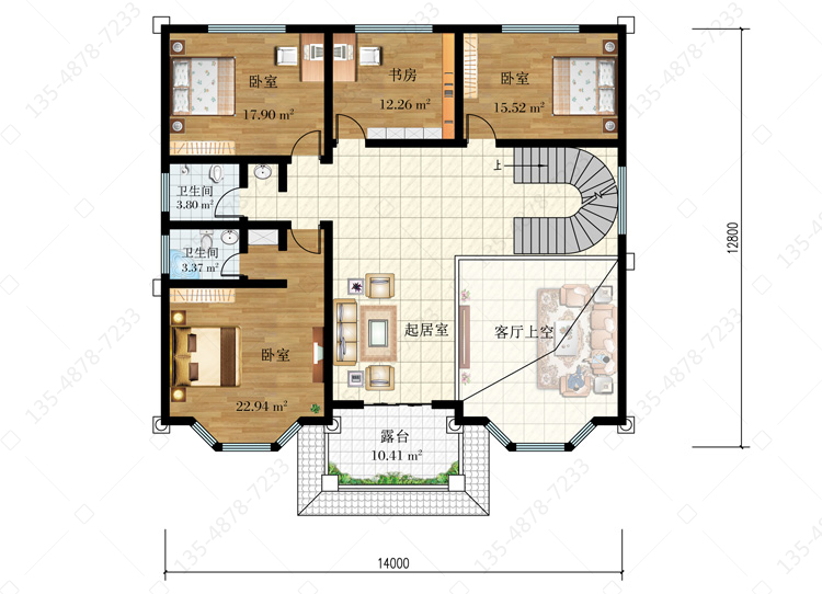 二 层:起居室、卧室(附卫生间)、书房、2卧室、卫生间、露台