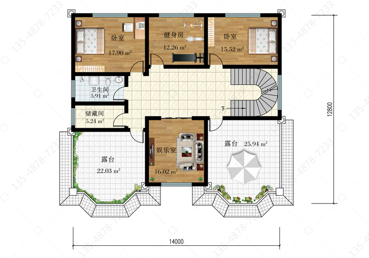 三 层:2卧室、健身房、储藏间、娱乐室、卫生间、2露台