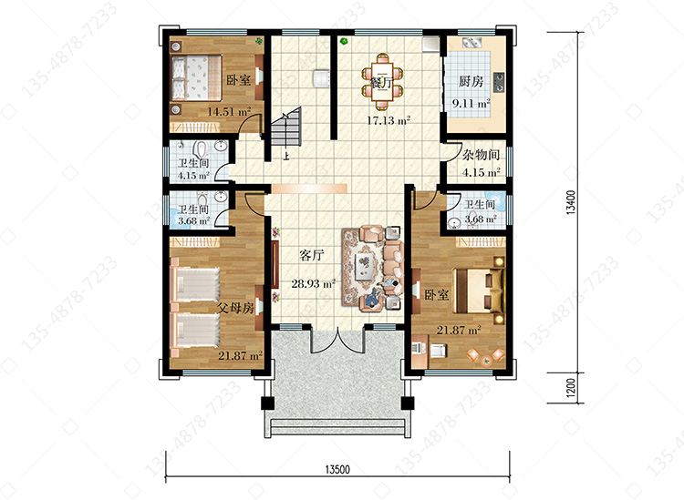 一 层:客厅、卧室(附卫生间)、卧室、父母房(附卫生间)、厨房、餐厅、杂物间、卫生间