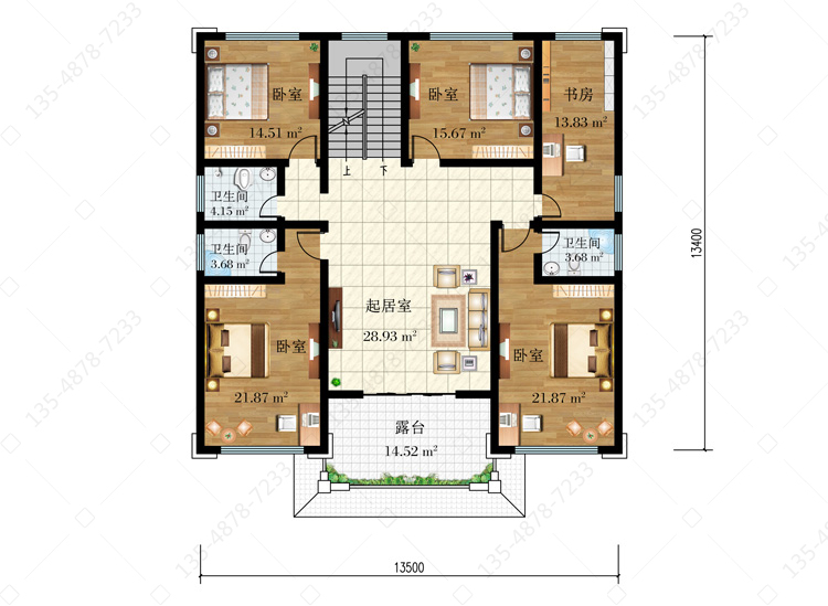二 层:起居室、2卧室(附卫生间)、2卧室、书房、卫生间、露台