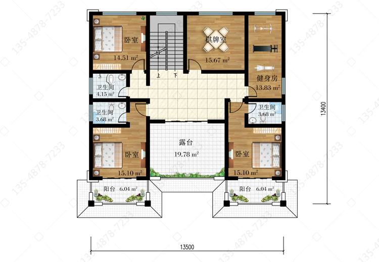 三 层:2卧室(附卫生间、阳台)、卧室、棋牌室、健身房、卫生间、露台