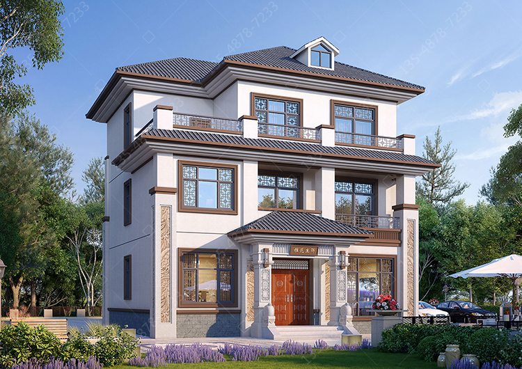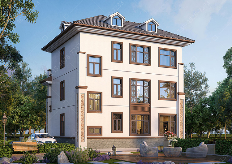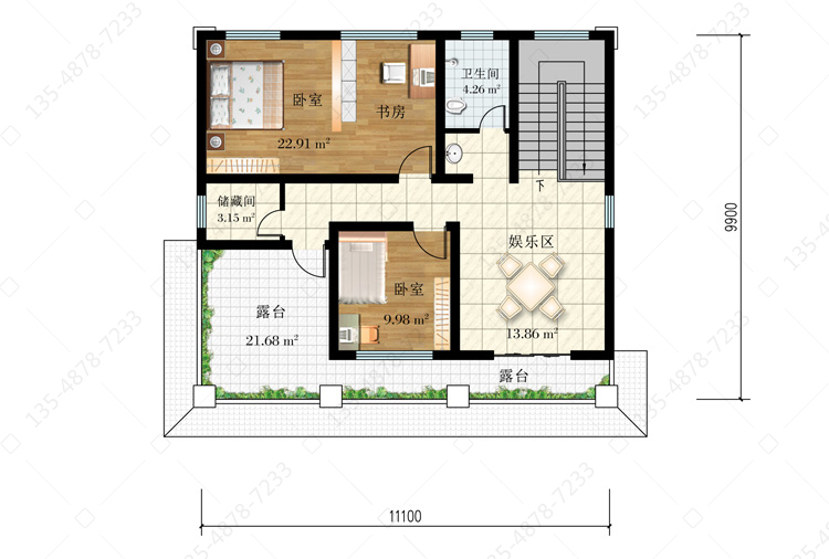 三 层:娱乐区、卧室(附书房)、卧室、储藏间、卫生间、露台