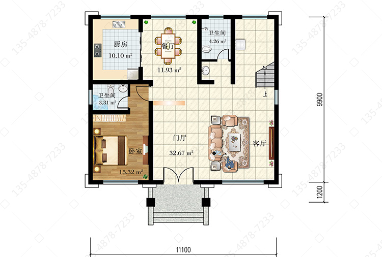 一 层:门厅、客厅、卧室(附卫生间)、厨房、餐厅、卫生间