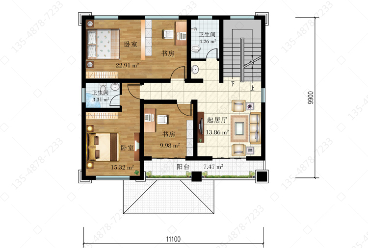 二 层:起居厅、卧室(附卫生间)、卧室(附书房)、书房、卫生间、阳台