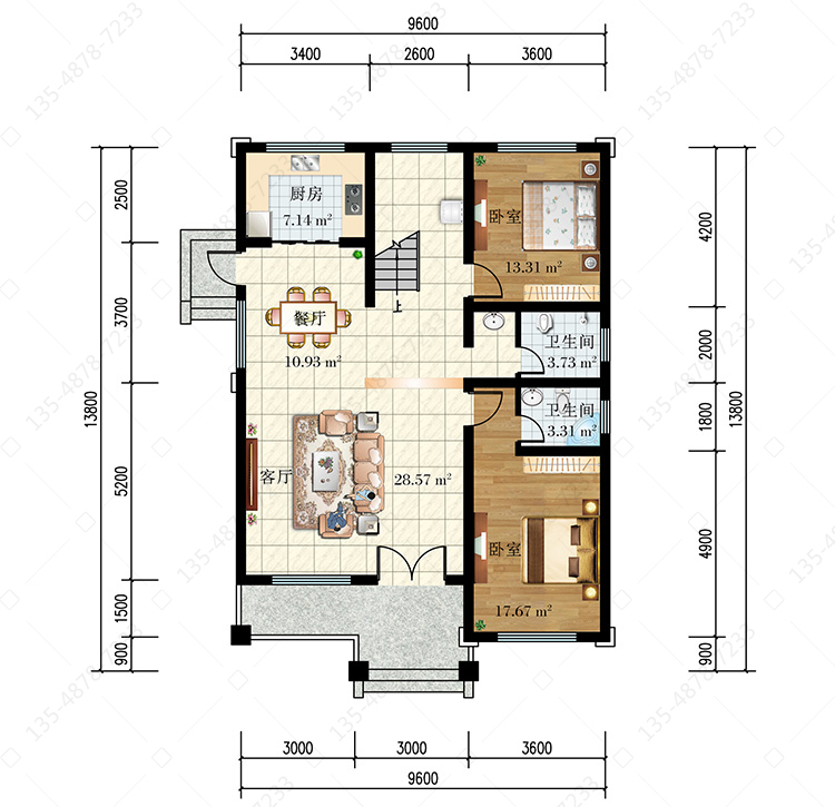 一 层:客厅、卧室、厨房、餐厅、卫生间